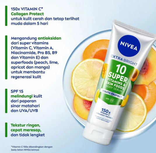 Body serum dengan 150x Vitamin C Collagen Protect untuk kulit cerah dan tetap terlihat muda dalam 5 hari. Tinggi antioksidan dari super vitamins (Vitamin C, Vitamin A, Niacinamide, Pro B5, B9 dan Vitamin E) dan super foods (peach, lime, apricot dan mango) untuk membantu regenerasi kulit. Dengan SPF 15 untuk melindungi kulit dari efek negatif sinar matahari, UVA dan UVB. Kelembaban intensif selama 24 jam. Formula dan tekstur ringan, cepat meresap dan tidak lengket.